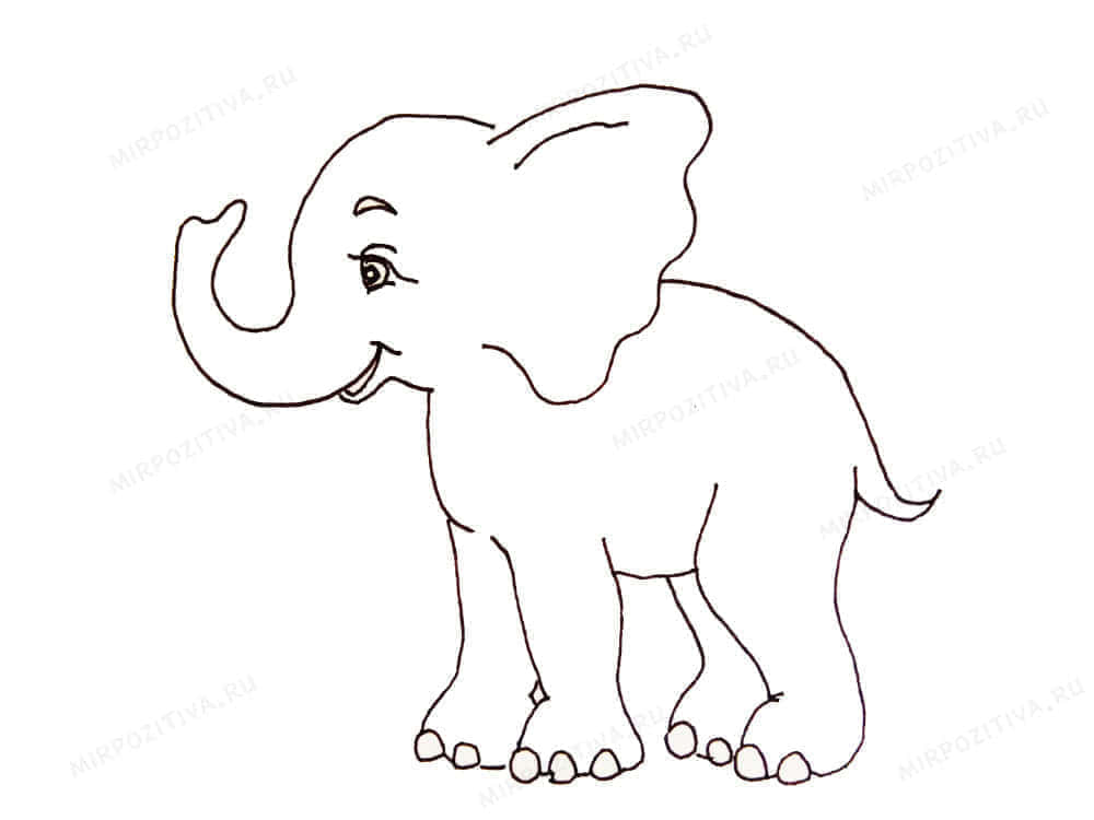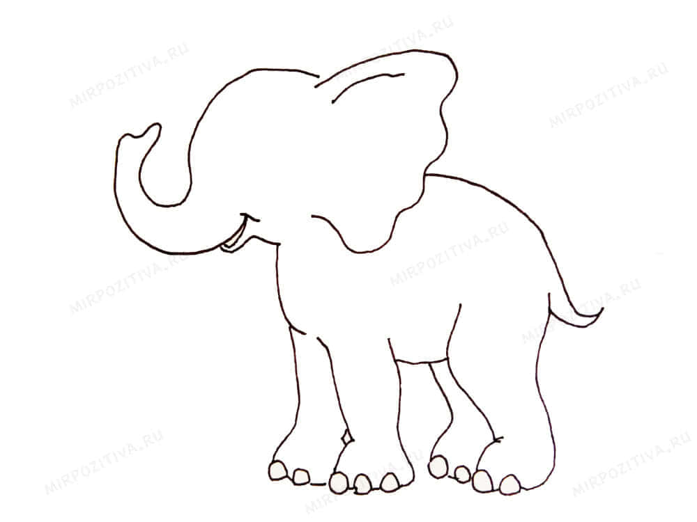 Дорисовываем ноги до конца. Обозначаем ширину хобота. Если провести линию от нижней части шеи слона и до кончика хобота – должна присутствовать иллюзия, что эта линия едина. Определяем где у животного рот и дорисовываем маленькую нижнюю губу. Линией намечаем недлинный хвостик.
