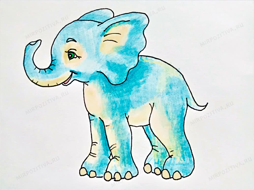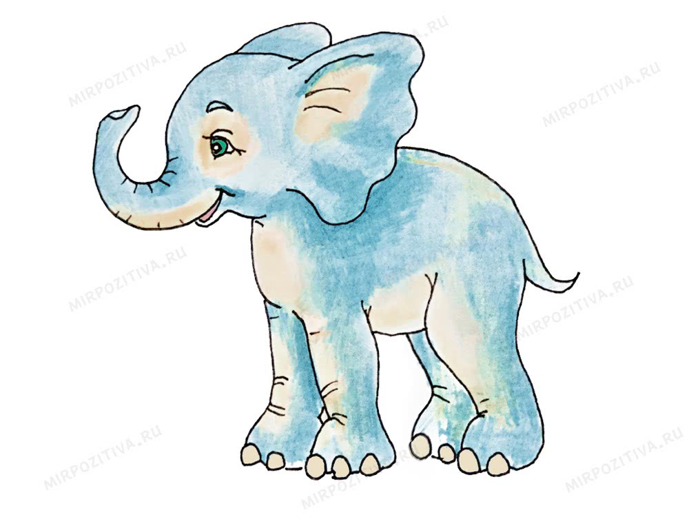 Закрасьте голубым цветом остальную поверхность тела слонёнка. Для раскрашивания можно использовать серый, коричневый, синий, фиолетовый и розовый карандаш. По желанию можно раскрасить и фон картинки.