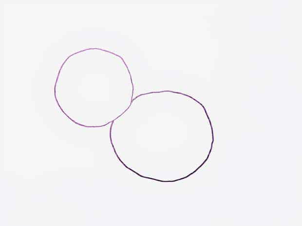 Пошаговый рисунок начинается с размещения изображения. На первом этапе нарисуйте два круга, один чуть меньше другого. Круги должны соприкасаться.