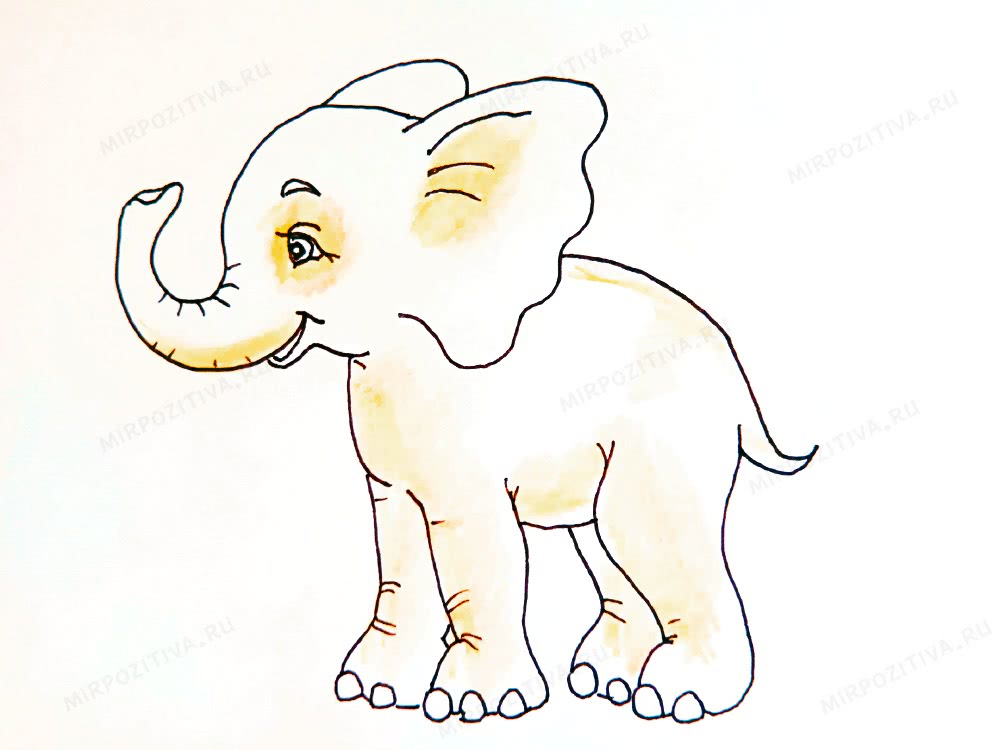 Закончите карандашный рисунок лёгкими штрихами вдоль хобота, ног и ушей. Малышам трудно обозначить свет и тень нажимом карандаша. Проще выделить светлые части вдоль линий хобота, живота, спины и ног жёлтым цветом.