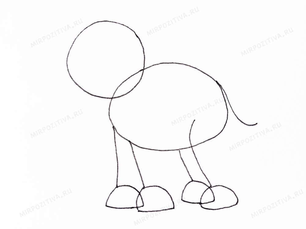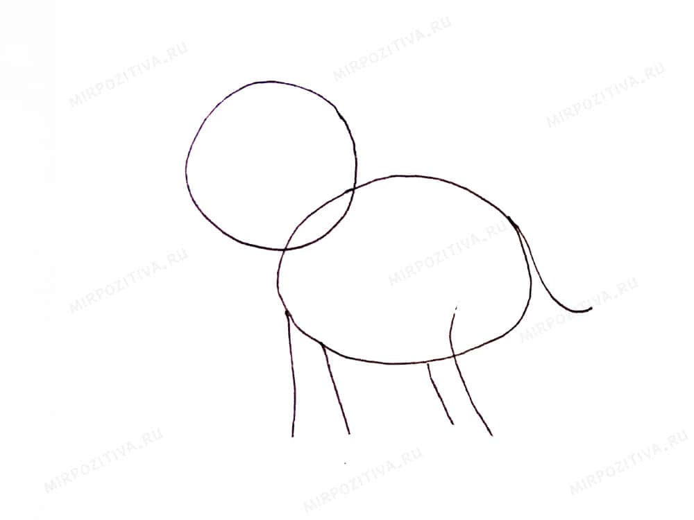 - От нижнего круга вниз рисуют ноги. Каждая нога представляет собой неоконченный прямоугольник. Одну из передних ног, наиболее удаленная от зрителя, может быть приподнята над землей.