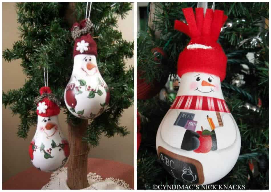 Новогодняя поделка снеговик из лампочки. Понадобиться лампа грушевидной формы. Изобразите на ней снеговика. Наденьте сверху шапочку. Ее можно связать самостоятельно, вырезать из свитера, носка или шарфа. Еще подойдет флисовый лоскуток, который нужно сшить или склеить.