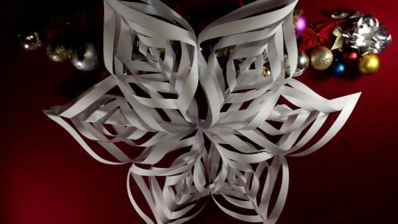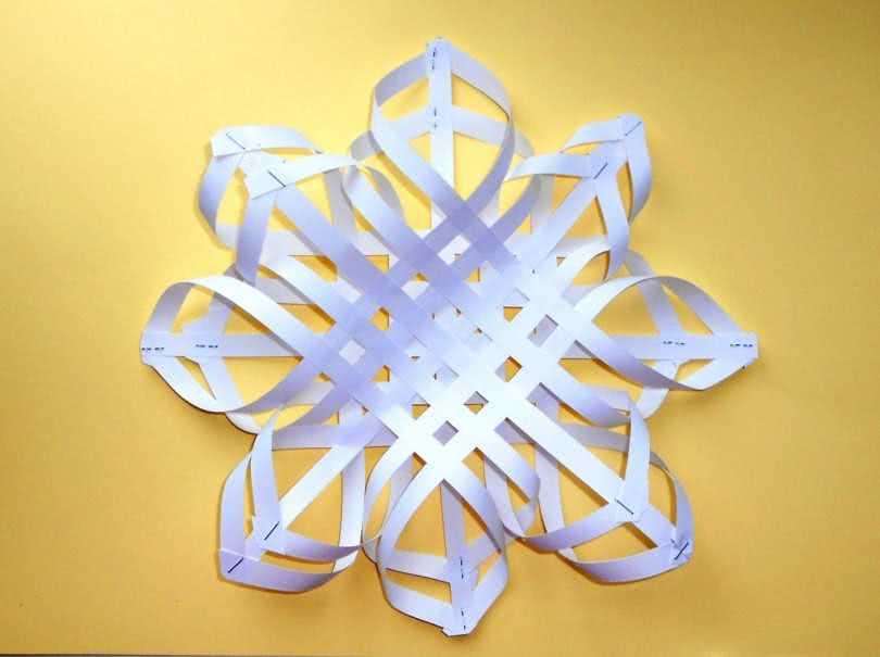 Эта снежинка смотрится воздушно и изящно. Все изделие состоит из нескольких полос одинаковой длины и ширины, скрепленных между собой.