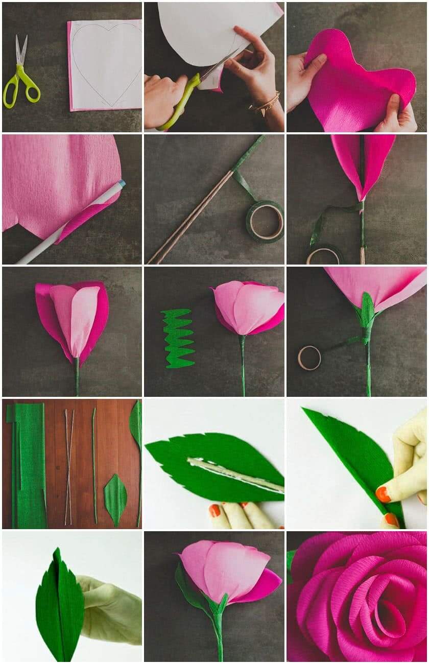 Сегодня популярность набирают огромные цветные розы, стоят они немало, а вот сделать их совсем несложно.