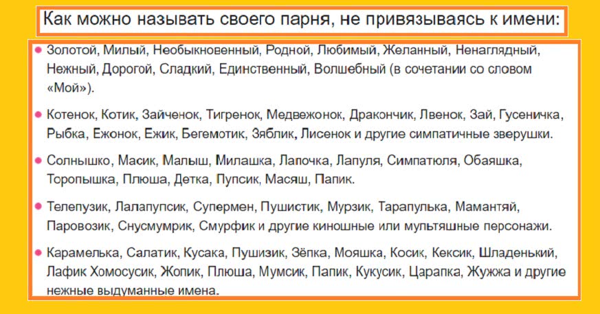 Теперь вы знаете, как можно ласково назвать парня, чтобы доставить ему удовольствие и улучшить духовную связь между вами. Когда отношения у вас только завязываются, следите за реакцией парня на прозвище. Если он обижается, поменяйте неприятную кличку на более ласковую или вовсе обходитесь без них.