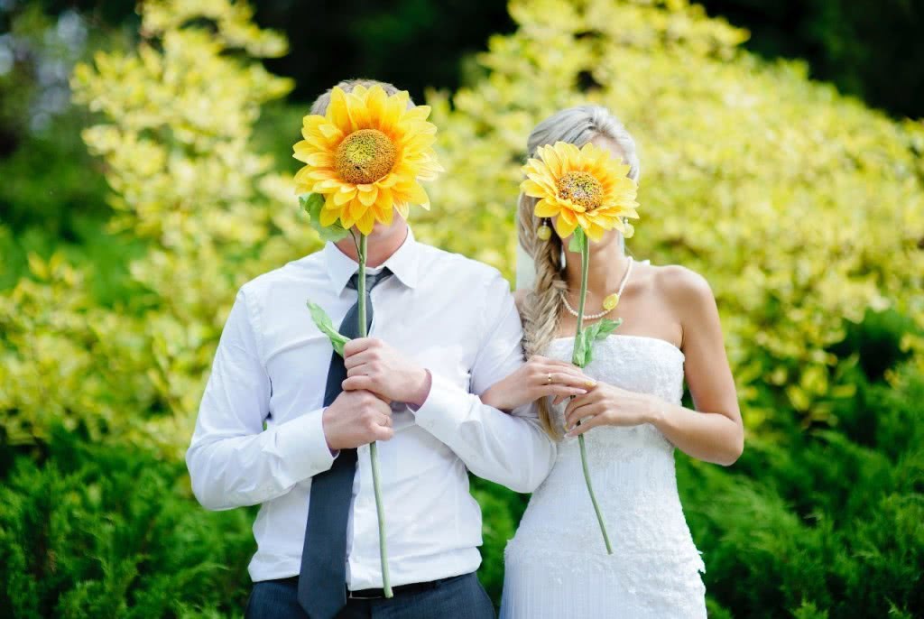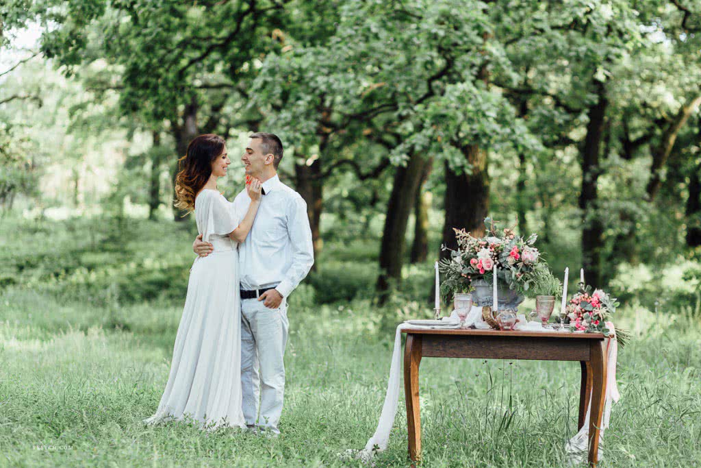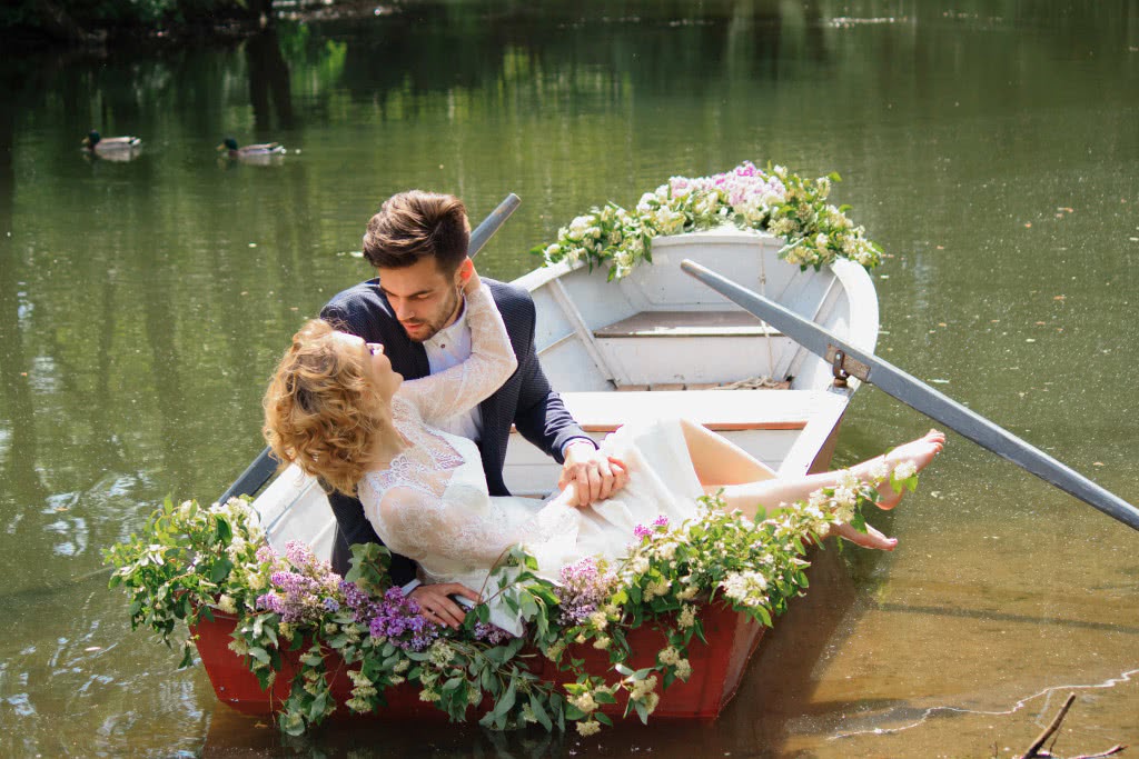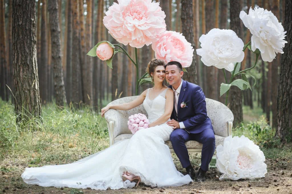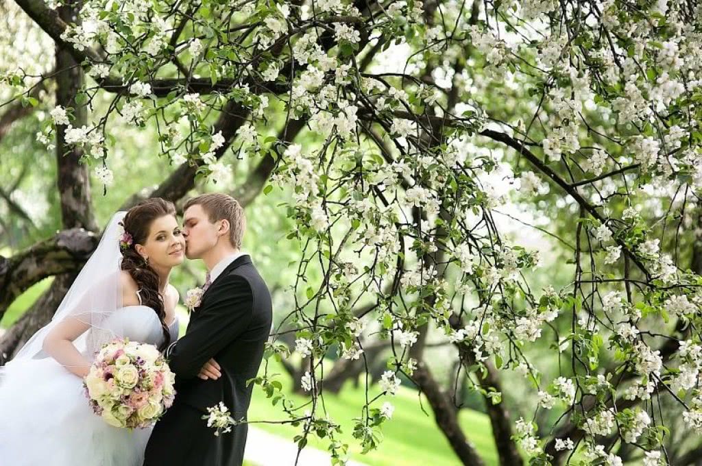 Строгие рамки государственного учреждения уже не ограничивают, поэтому стоит проявить фантазию. Выездная регистрация обычно проходит на фоне цветочной арки или другой притягивающей взгляд конструкции, поэтому попросите фотографа запечатлеть вас в поцелуе на ее фоне: