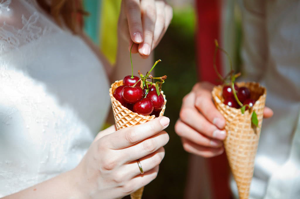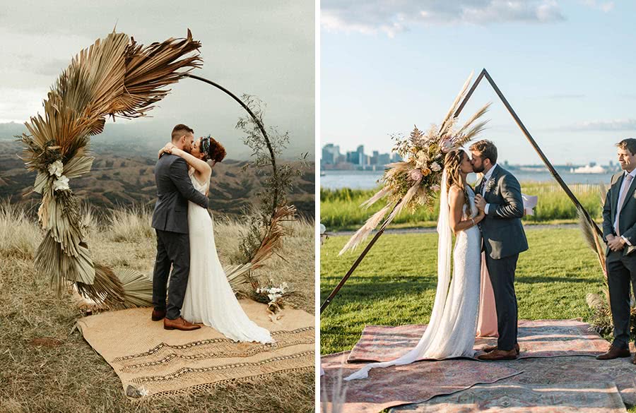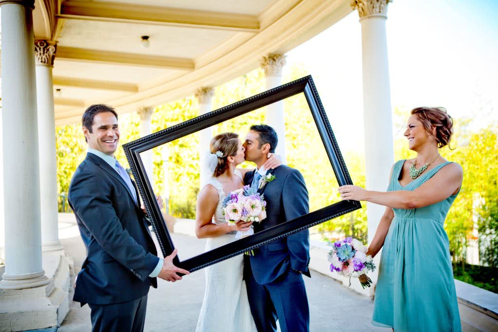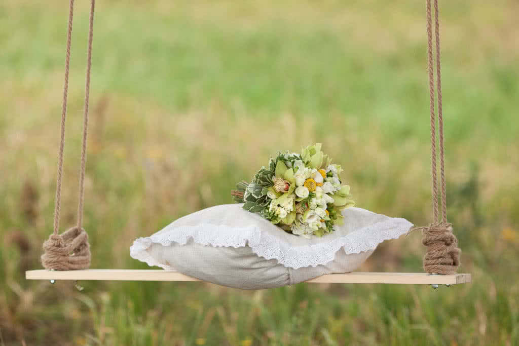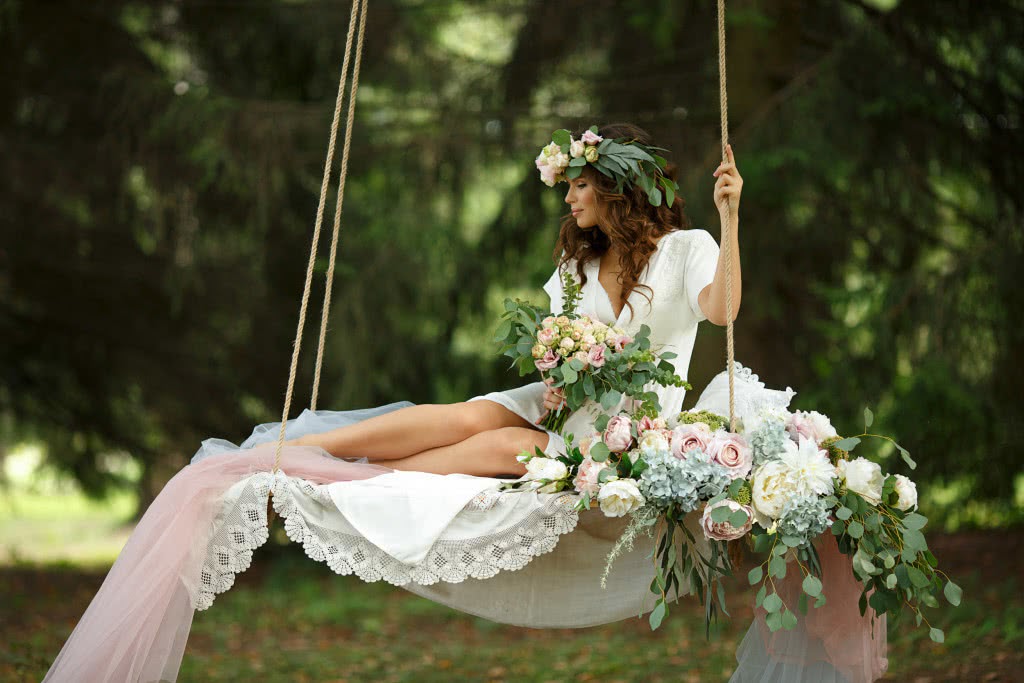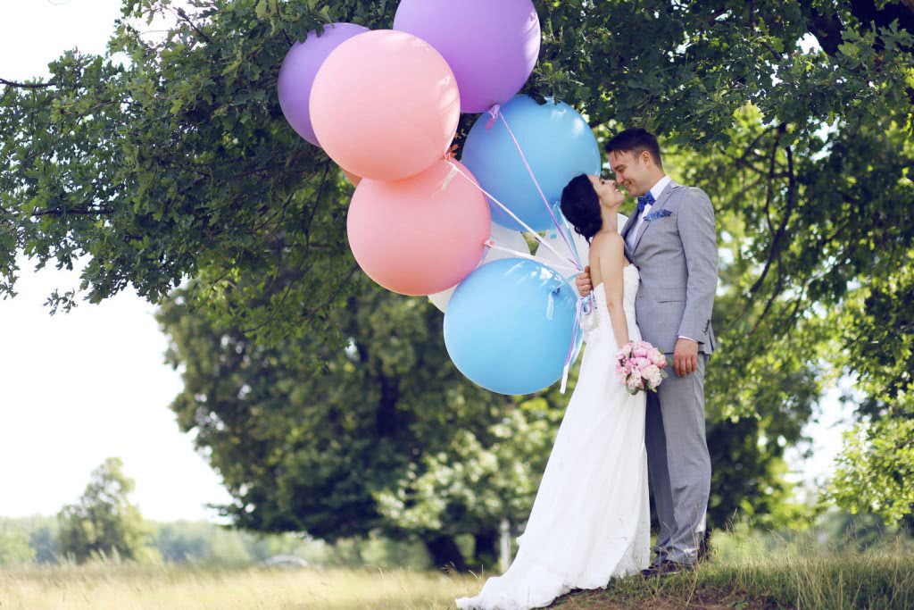 Строгие рамки государственного учреждения уже не ограничивают, поэтому стоит проявить фантазию. Выездная регистрация обычно проходит на фоне цветочной арки или другой притягивающей взгляд конструкции, поэтому попросите фотографа запечатлеть вас в поцелуе на ее фоне: