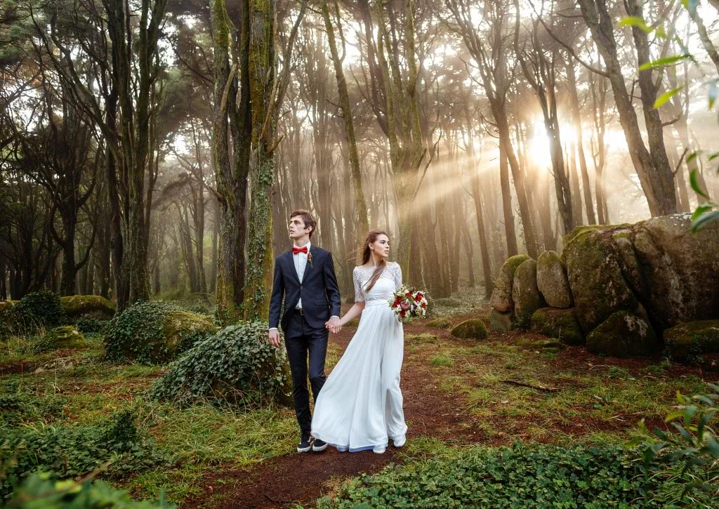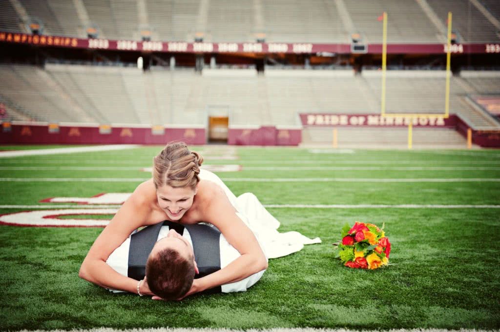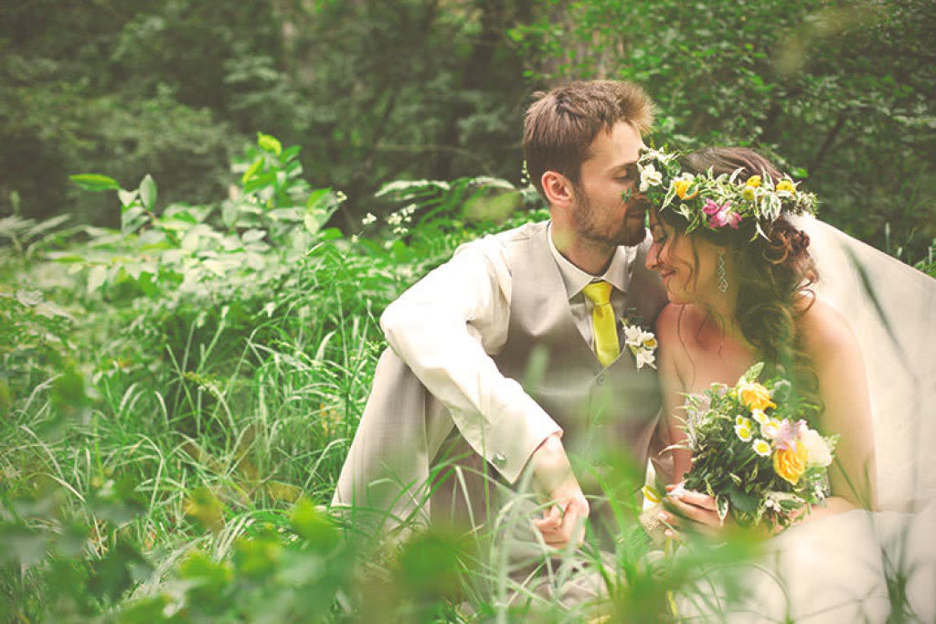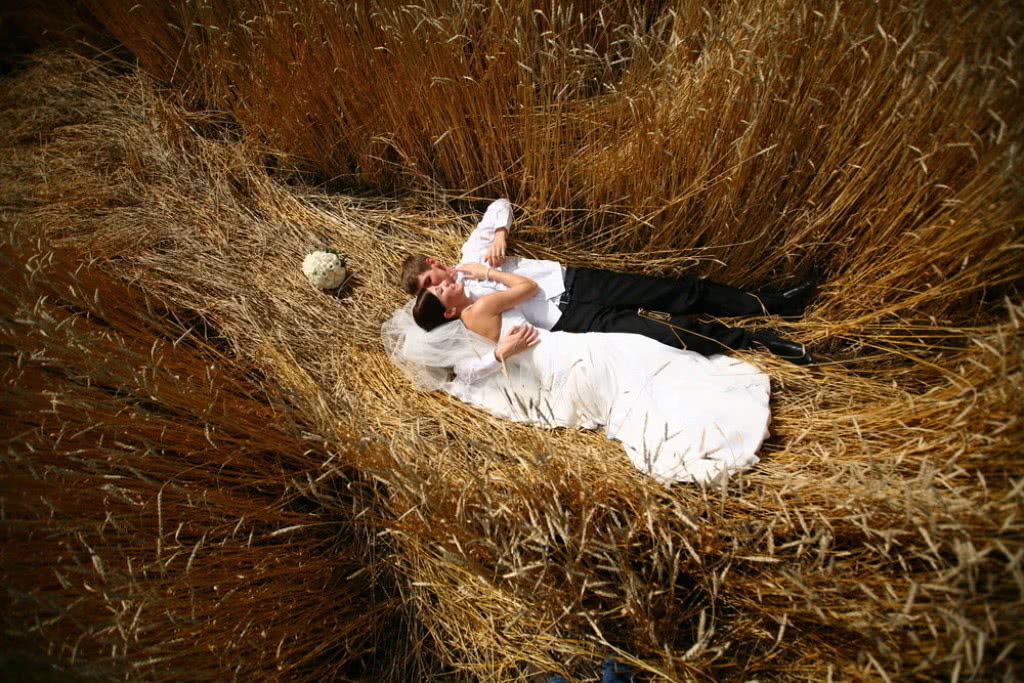Наконец, в поисках удачных поз для свадебной фотосессии, не брезгуйте «реквизитом», попадающимся на пути: деревьями, валунами, травой, стенами и машинами (в городе):