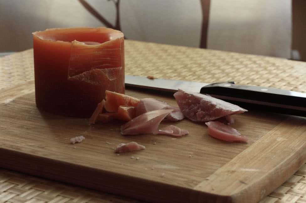 Большинство видов, которые продаются в магазине, поступают в продажу в форме гранул. Это облегчает работу, так как гранулы быстрее расплавляются. Если вы купили блок, используйте острый нож, чтобы нарезать его на мелкие куски.