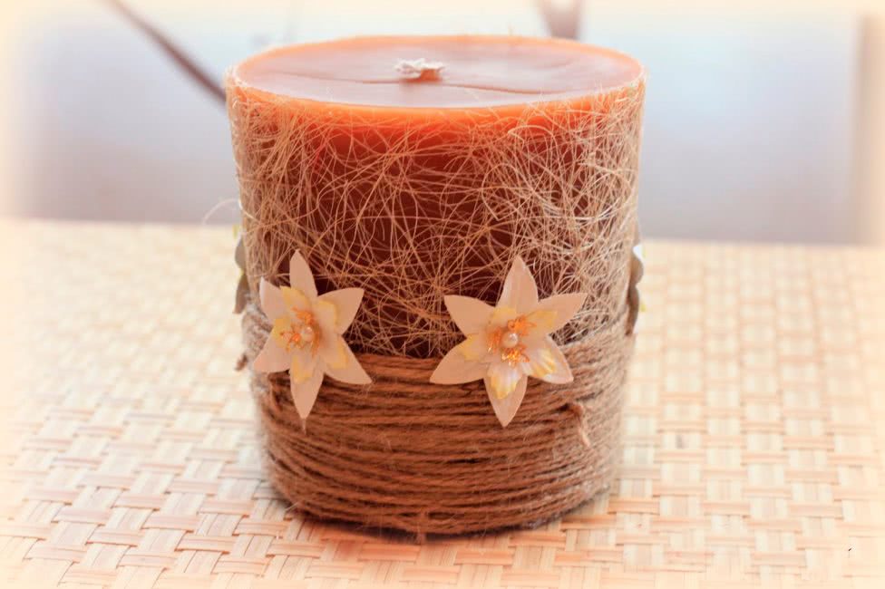 В специализированном магазине можно найти специальные наклейки для декора. Или же декупаж — прекрасный способ украшения свечей. Кстати, весьма модный в среде профессиональных свечников. Чаще всего, в качестве основы декупажа используются салфетки. Не забывайте о технике безопасности: пользуйтесь специальным лаком для свечей.