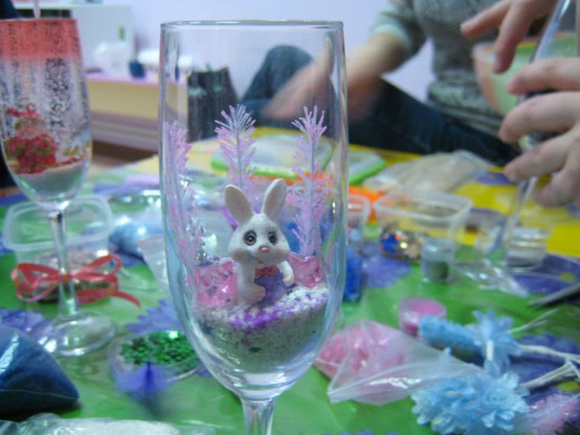 Пока гель нагревается, есть время подготовить материалы. Расставить выбранные стаканы или вазочки. Взять стакан, ко дну приклеить фитиль, второй его конец прикрепить к палочке или прищепке и вывести над стаканом, насыпать песок в один или несколько слоев, рассыпать сверху декор.