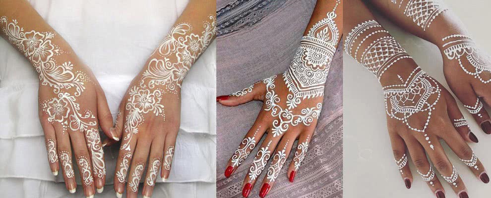 Особенно стильно смотрится мехенди белой хной, такие орнаменты часто привлекают девочек и юных леди. Сегодня делать рисунки белой хной на руке для девушек очень модно, это символизирует чистоту, поэтому такие узоры нередко используют невесты.