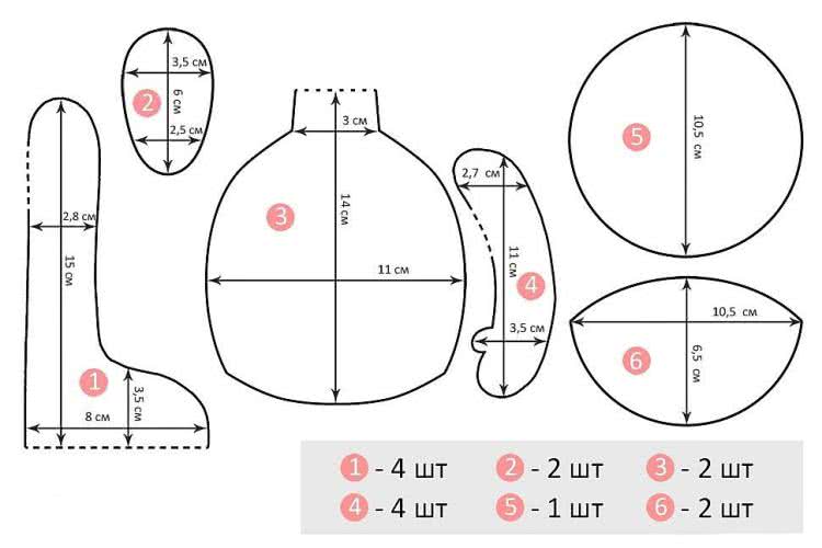 - Перенесите выкройку на ткань и вырежьте части тела.