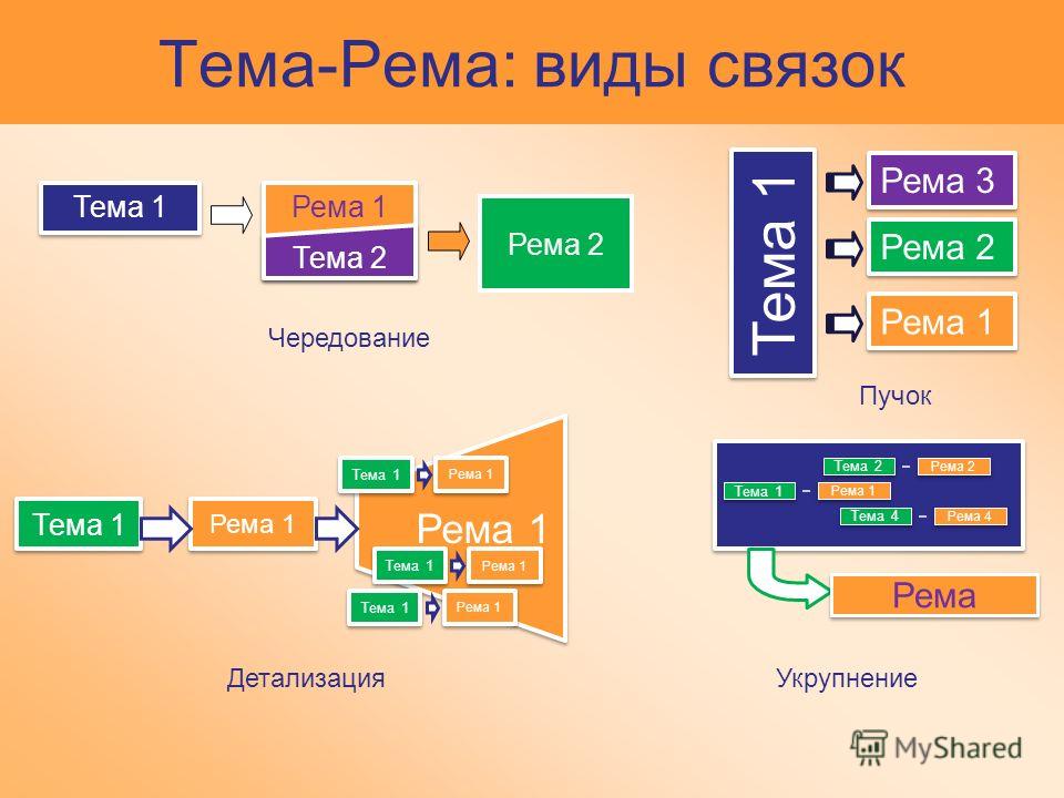 Тема-Рема: виды связок Чередование Тема 1 Рема 1 Рема 2 Рема 3 Пучок Рема 1 Тема 1 Тема 2 Рема 2 Тема 1 Рема 1 Тема 1 Рема 1 Тема 1 Рема 1 Тема 1 Рема 1 Детализация Рема Тема 1 Рема 1 Тема 2 Рема 2 Тема 4 Рема 4 Укрупнение