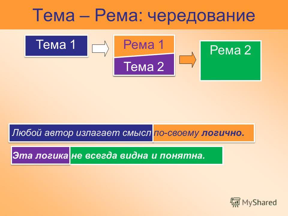 Тема – Рема: чередование Любой автор излагает смысл по-своему логично. Эта логика не всегда видна и понятна. Рема 1 Тема 1 Тема 2 Рема 2