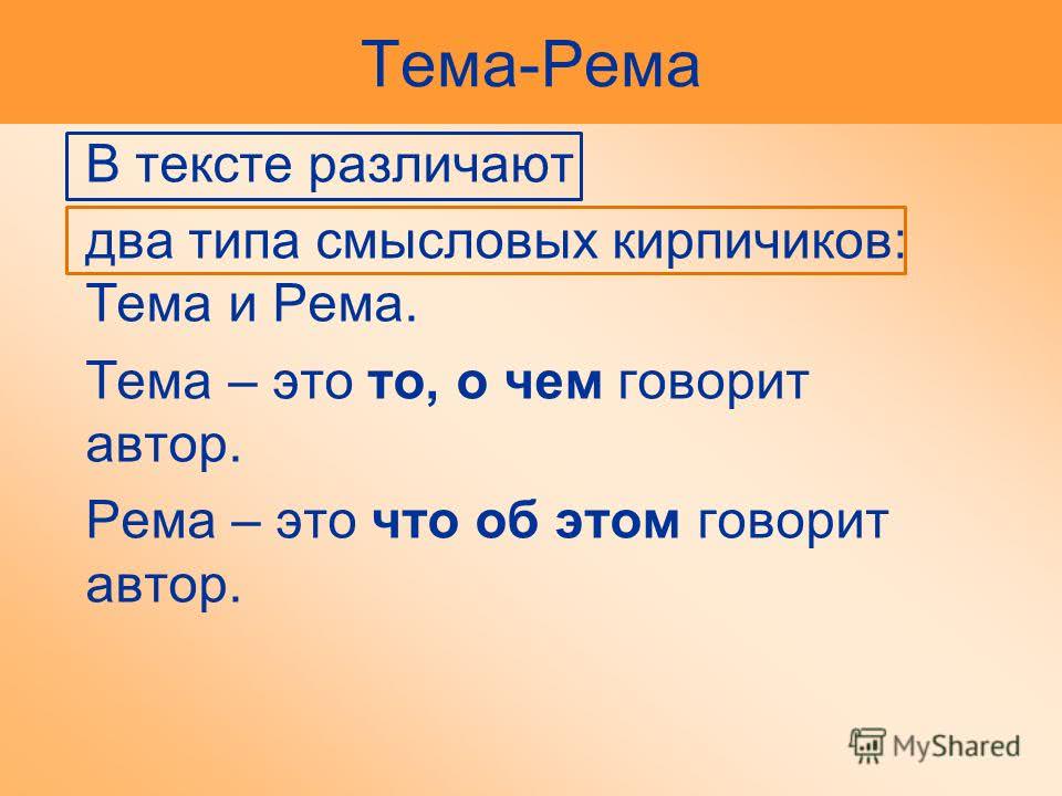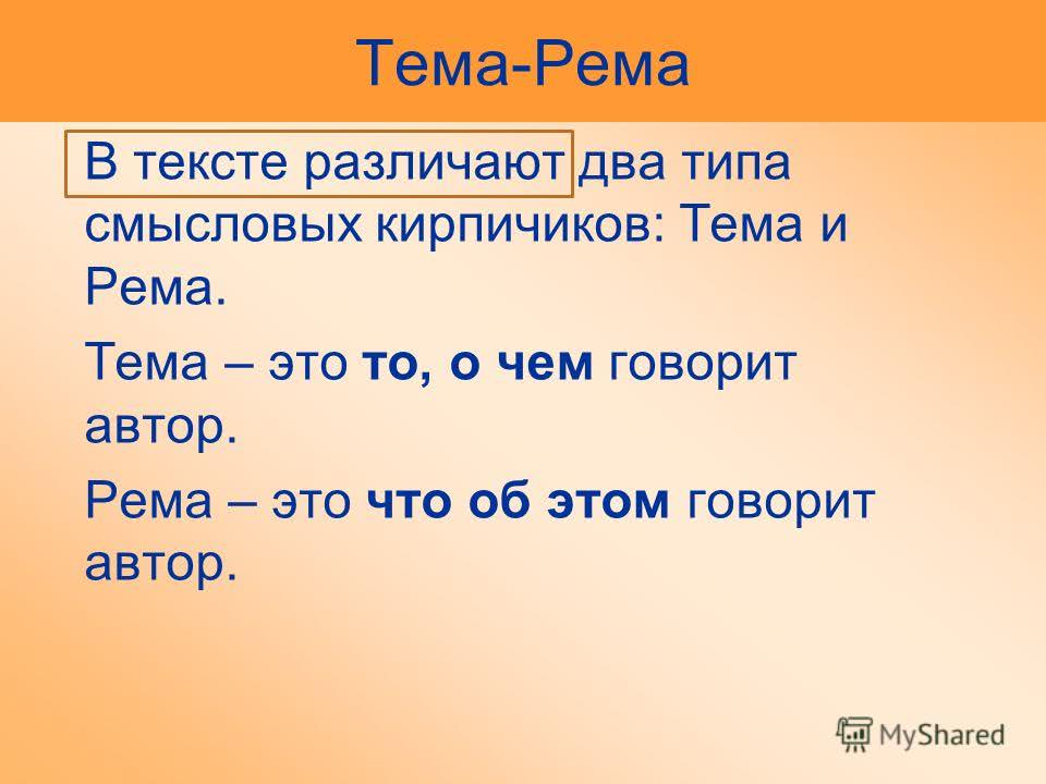 Тема-Рема два типа смысловых кирпичиков: Первый тип – Тема Второй тип – Рема. Тема – это то, о чем говорит автор. Рема – это что об этом говорит автор.