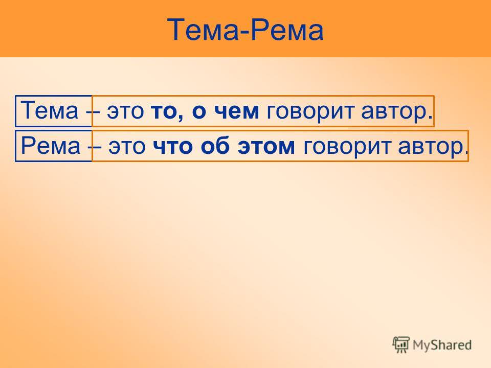 Тема-Рема Тема – это то, о чем говорит автор. Рема – это что об этом говорит автор.