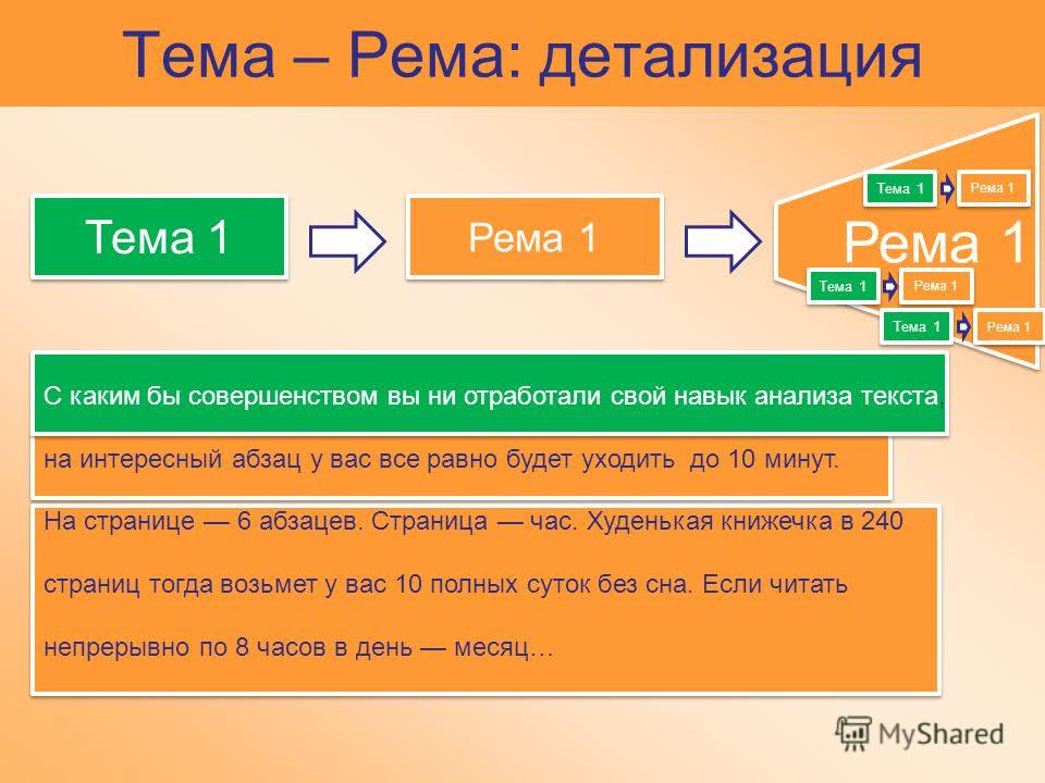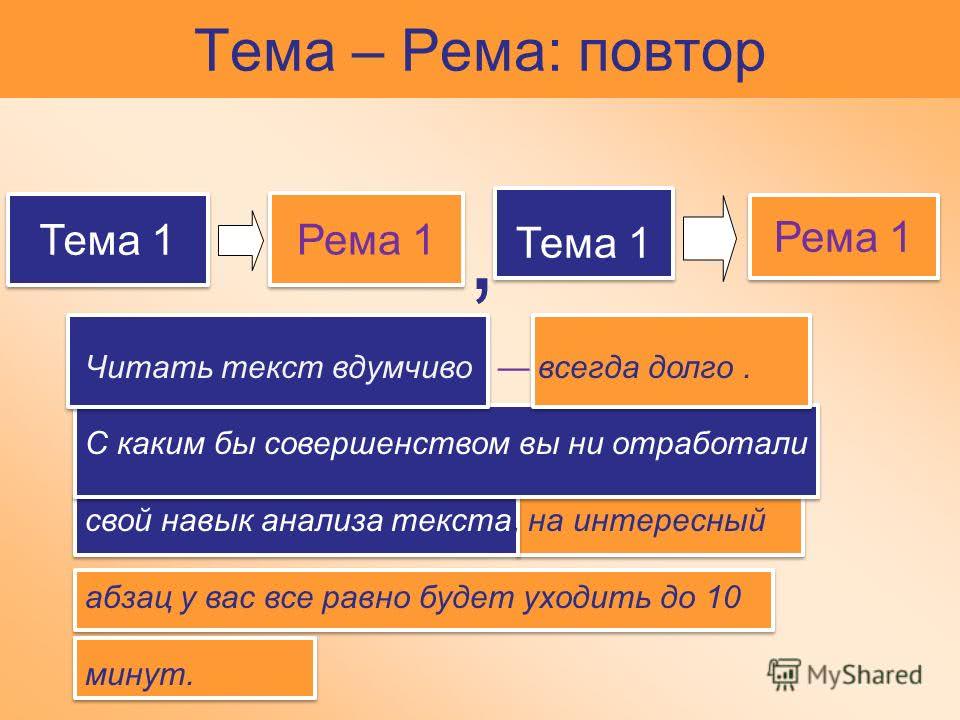 Читать текст вдумчиво всегда долго. С каким бы совершенством вы ни отработали свой навык анализа текста, на интересный абзац у вас все равно будет уходить до 10 минут. Тема – Рема: повтор Рема 1 Тема 1, Рема 1 Тема 1