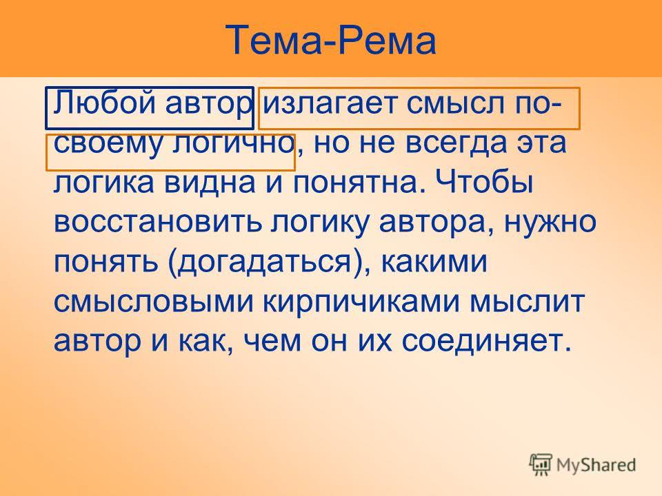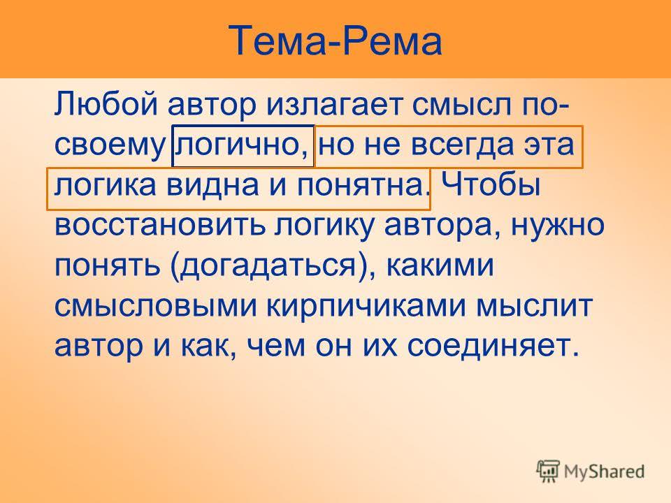 Тема-Рема Любой автор излагает смысл по- своему логично, но не всегда эта логика видна и понятна. Чтобы восстановить логику автора, нужно понять (догадаться), какими смысловыми кирпичиками мыслит автор и как, чем он их соединяет.