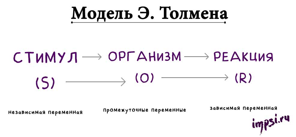 Онсчитал, что бихевиористская модель S-R должна быть дополнена. По его мнению, формула поведения должна состоять не из двух, а из трех членов, и поэтому выглядеть следующим образом: стимул (независимая переменная) — промежуточные переменные (организм) — зависимая переменная (реакция), т.е. S-O-R.