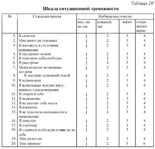 Представленная далее методика, разработанная Спилберге- ром, предназначена для одновременной оценки двух названных видов тревожности. Она включает в себя две шкалы, каждая из которых отдельно оценивает личностную или ситуационную тревожность. Ниже, в таблице 20, даются описания этих шкал.