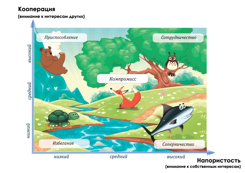 Для более наглядного представления наиболее ярких качеств и моделей поведения в конфликтах, каждую из ситуаций можно представить в виде образов тех или иных животных: лиса, медведь, черепаха, сова и акула.