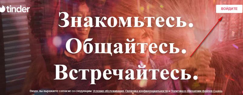 После установки на свой телефон приложения и прохождения регистрации можно воспользоваться сайтом https://tinder.com/?lang=ru. Здесь нам предлагают авторизоваться при помощи телефона, страницы Facebook или электронной почты.