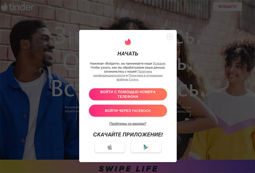 Для начала нужно либо скачать приложение на смартфон из App Store или Google Play, либо зайти на web-версию Tinder. Зарегистрироваться можно с помощью аккаунта в Facebook, или указав свой номер телефона.