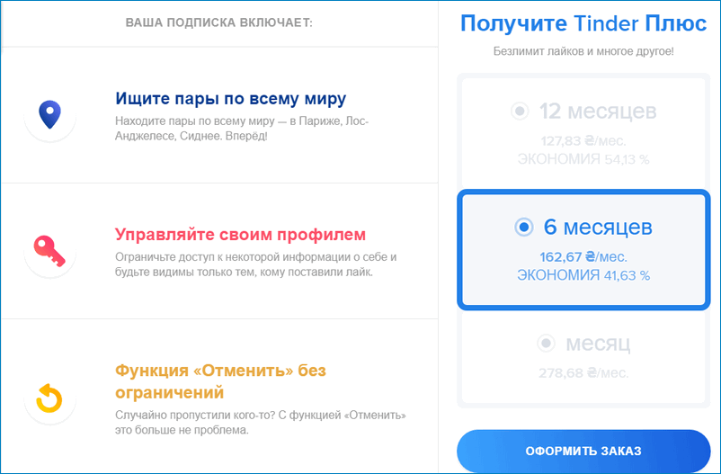 - Tinder Plus. Входят все те же опции, кроме возможности узнать, кто поставил лайк.