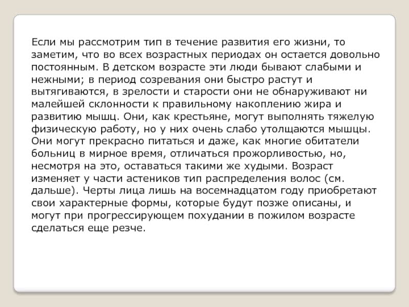 Если мы рассмотрим тип в течение развития его жизни, то заметим, что во всех возрастных периодах он остается довольно постоянным. В детском возрасте эти люди бывают слабыми и нежными; в период созревания они быстро растут и вытягиваются, в зрелости и старости они не обнаруживают ни малейшей склонности к правильному накоплению жира и развитию мышц. Они, как крестьяне, могут выполнять тяжелую физическую работу, но у них очень слабо утолщаются мышцы. Они могут прекрасно питаться и даже, как многие обитатели больниц в мирное время, отличаться прожорливостью, но, несмотря на это, оставаться такими же худыми. Возраст изменяет у части астеников тип распределения волос (см. дальше). Черты лица лишь на восемнадцатом году приобретают свои характерные формы, которые будут позже описаны, и могут при прогрессирующем похудании в пожилом возрасте сделаться еще резче.