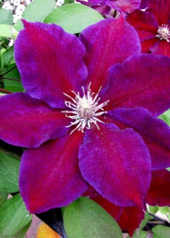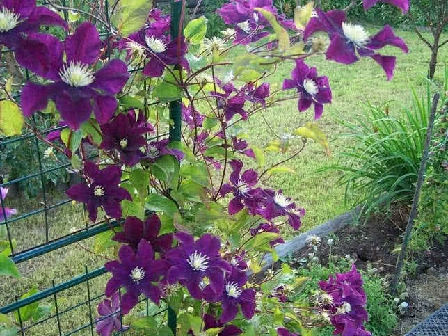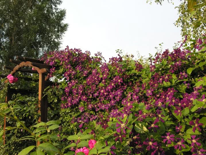 Фиолетовые цветки клематиса Юлька хорошо сочетаются с лианами других оттенков.