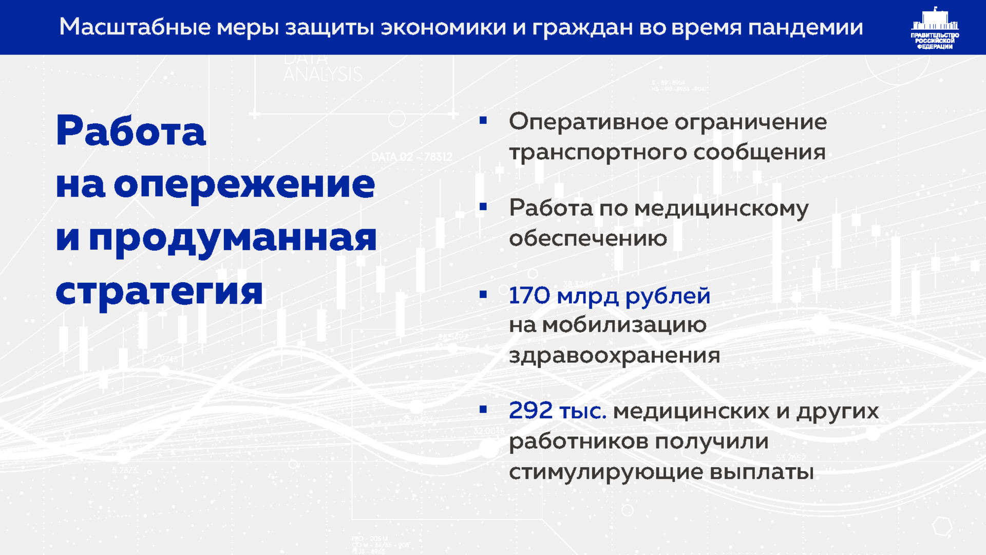Михаил Мишустин также указал, что правительство пошло на существенное смягчение бюджетной политика для запуска программ поддержки людей и экономики. По его словам, принимаемые в этом направлении меры были «беспрецедентны и по сумме выделенных средств, и по охвату отраслей». Так, различные формы поддержки на сумму около 600 млрд руб. получили семьи, в которых воспитываются более 26,5 млн детей.