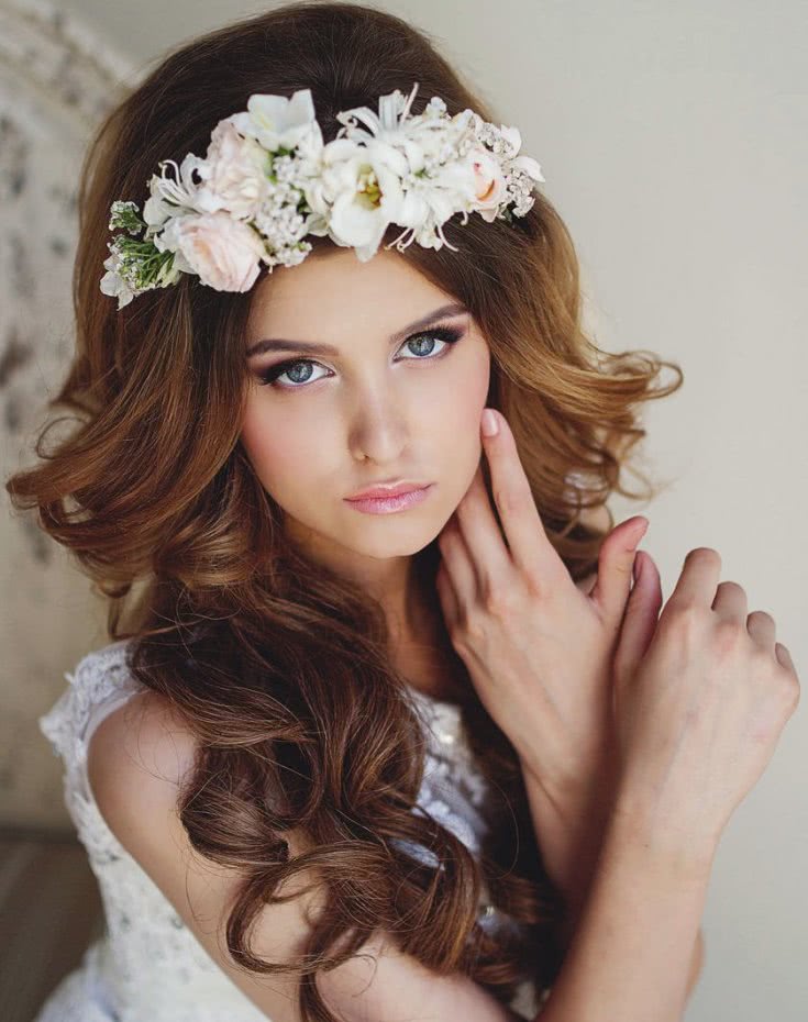 - Свободные, легко завитые локоны, распущенные в нарочитом беспорядке. От висков можно пустить на затылок две пряди или тонкие косички, скрепив их там. Летом актуальны венки и украшения из живых цветов, зимой можно воспользоваться различными ювелирными изделиями.