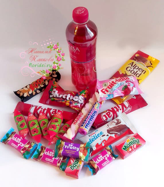 Итак, нам понадобится обычный набор для создания такого конфетного букетика: газированный (можно и просто чай в бутылке) напиток, конфетки «Красный мак», «Черри», «Мамба», «Скитлз», «Кит Кат», большая шоколадка «Alpen Gold», «Mentos».