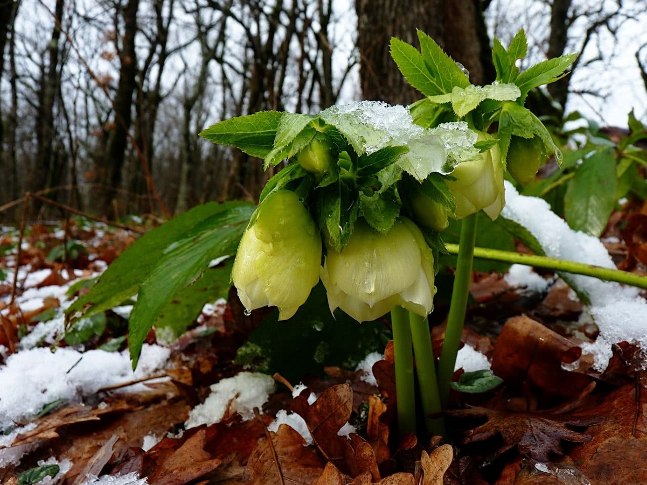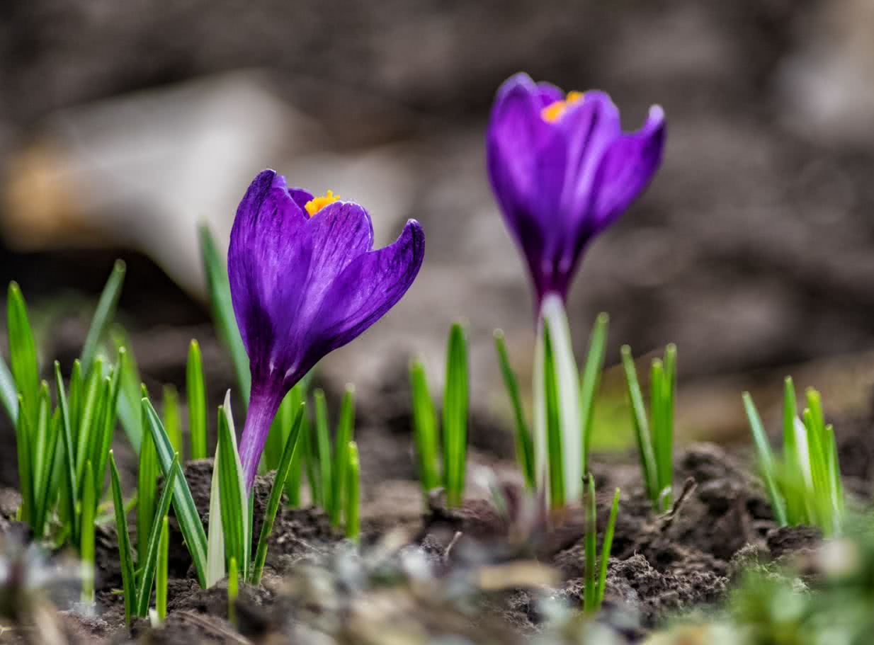 Первая травка и цветы, пробивающиеся из увлажненной талым снегом почвы