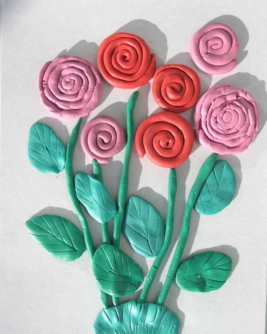 Нужен зеленый, розовый и красный пластилин, цветной картон, стека. Сначала укладываем на лист цветного картона стебли – тонкие зеленые колбаски. К ним прилепливаем листья с нарисованными стекой жилками. А для верхушек стеблей делаем бутоны: скатываем колбаски и сворачиваем их спиралью. Должен получиться большой букет больших и маленьких розочек.