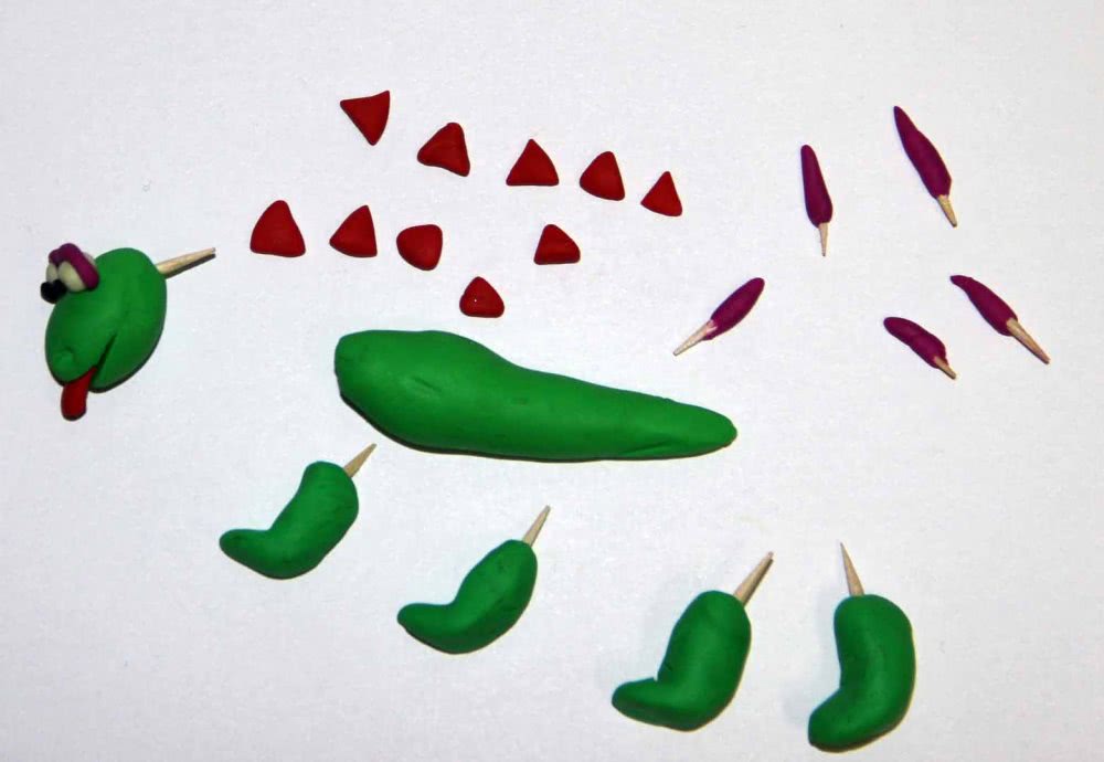 - Катаем шарики и цилиндр из зеленого пластилина, размером таким, какого динозавра мы хотим получить. И также вырезаем треугольники их красного пластилина. И небольшие фиолетовые колбаски.