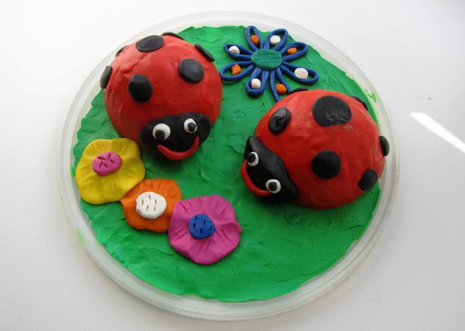 Очень красивой всегда оказывается композиционная лепка пластилином для детей, фото божьих коровок на полянке это доказывает: