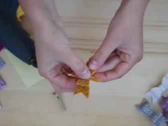 Теперь нужно сделать бабочку. Для этого каждый из концов заготовки нужно приложить к центру и зафиксировать при помощи небольшого количества клея. На снимке демонстрируется, как это правильно сделать.
