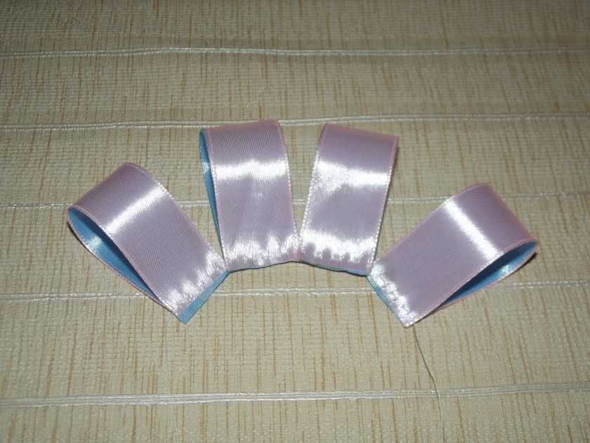 - Две ленточки разного цвета складываются изнаночной стороной, чтобы смотрели друг на друга.