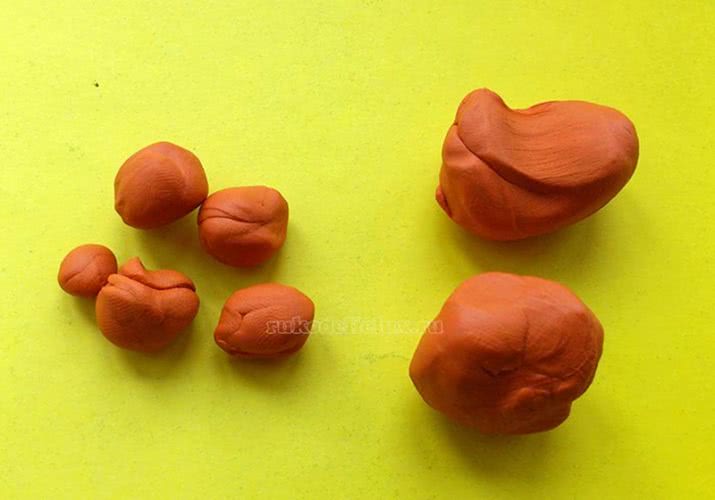 - Скатайте один оранжевый шарик побольше и пять маленьких — из коричневого.