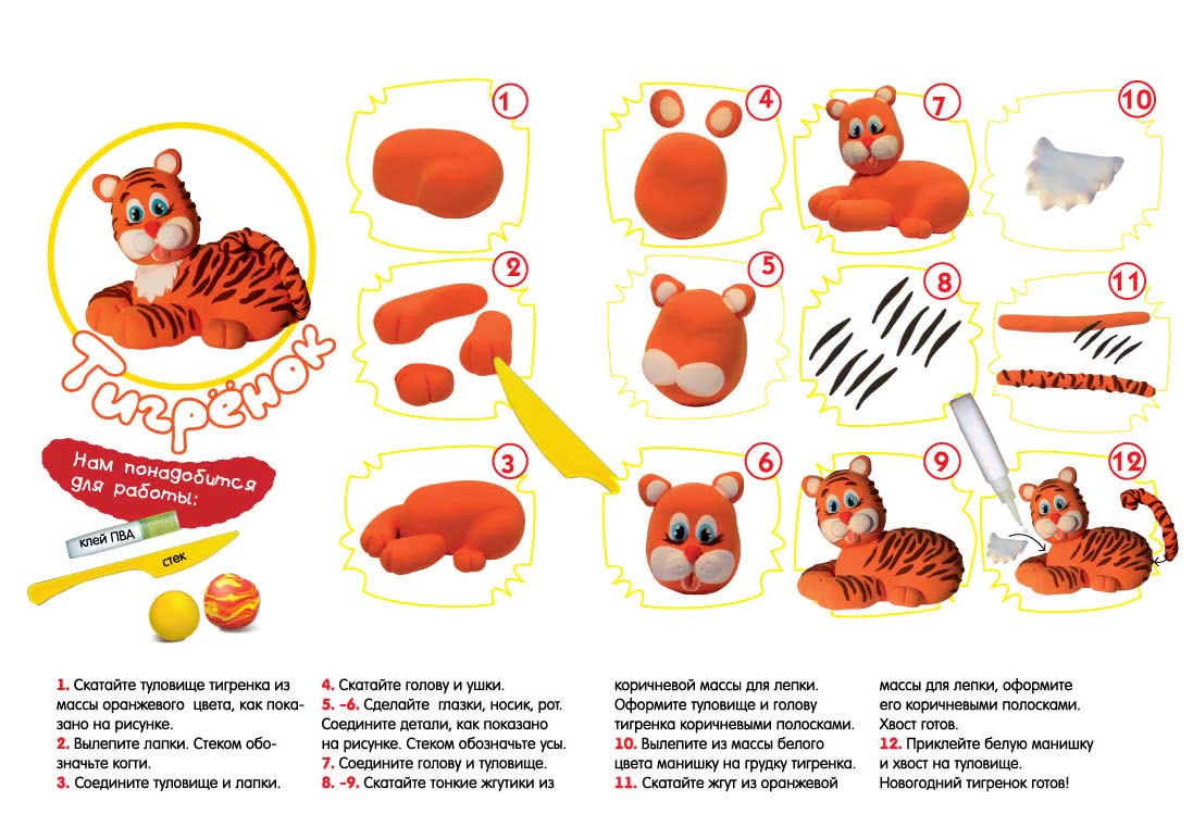 Далее смотрите подробную схему изготовления маленького тигренка из оранжевого пластилина.