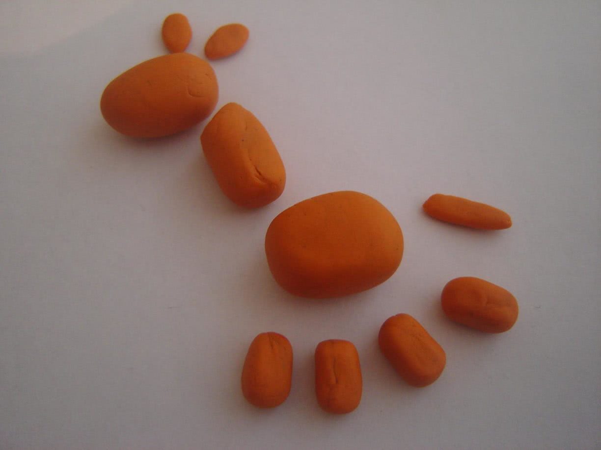 Крепкие ноги формируют из 2 толстых валиков, изогнутых посередине. Стеком выделяют пальцы. Верхние лапы — это 2 колбаски. После прикрепления к туловищу их края загибают внутрь.