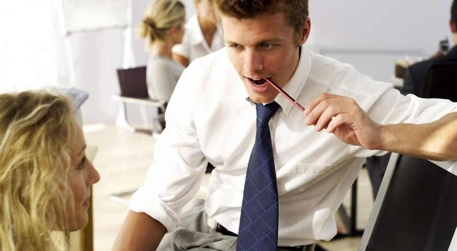 Пристальный взгляд. Влюбленный коллега часто и долго рассматривает девушку, любуясь ее красотой. Если он пристально смотрит на губы, то это говорит о сильном желании поцеловать девушку.